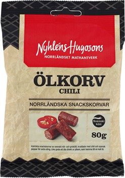 Svenska Köttråvaror. Till 100g färdigvara har 173g köttråvara använts. Ingredienser: Gris-& nötkött, fett från gris, salt, kryddor (chili, peppar, vitlök, paprika, lök, koriander, humle), druvsocker (majs), kryddextrakt (peppar, chili, libbsticka) antioxidationsmedel (E301), konserveringsmedel (E250)